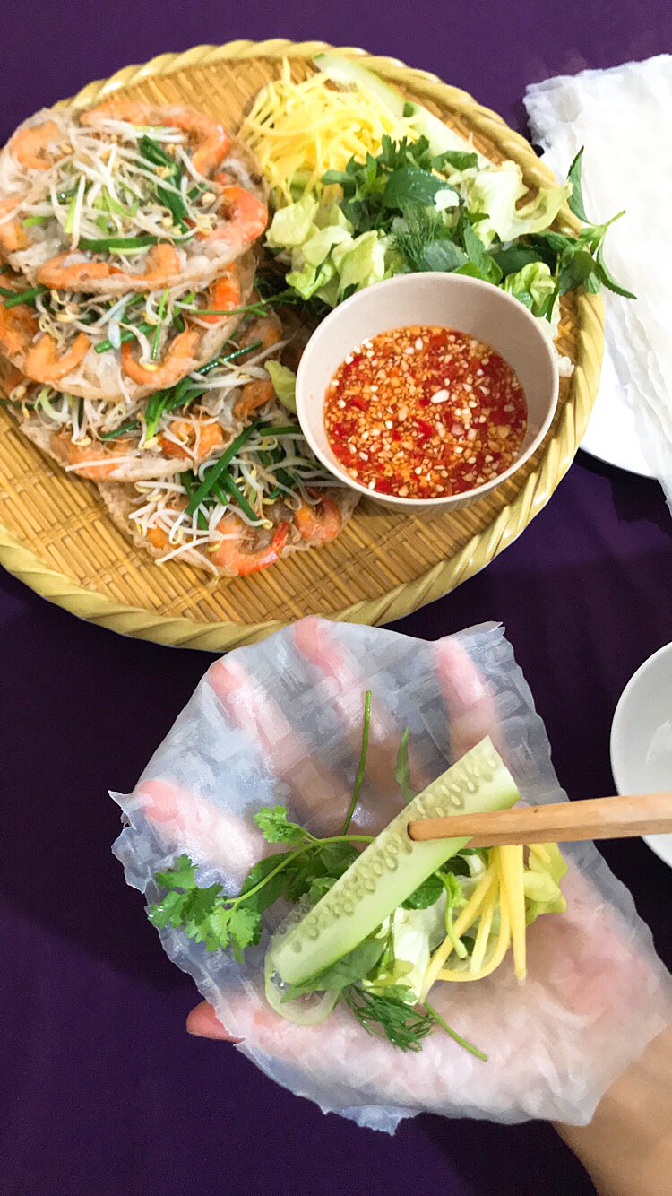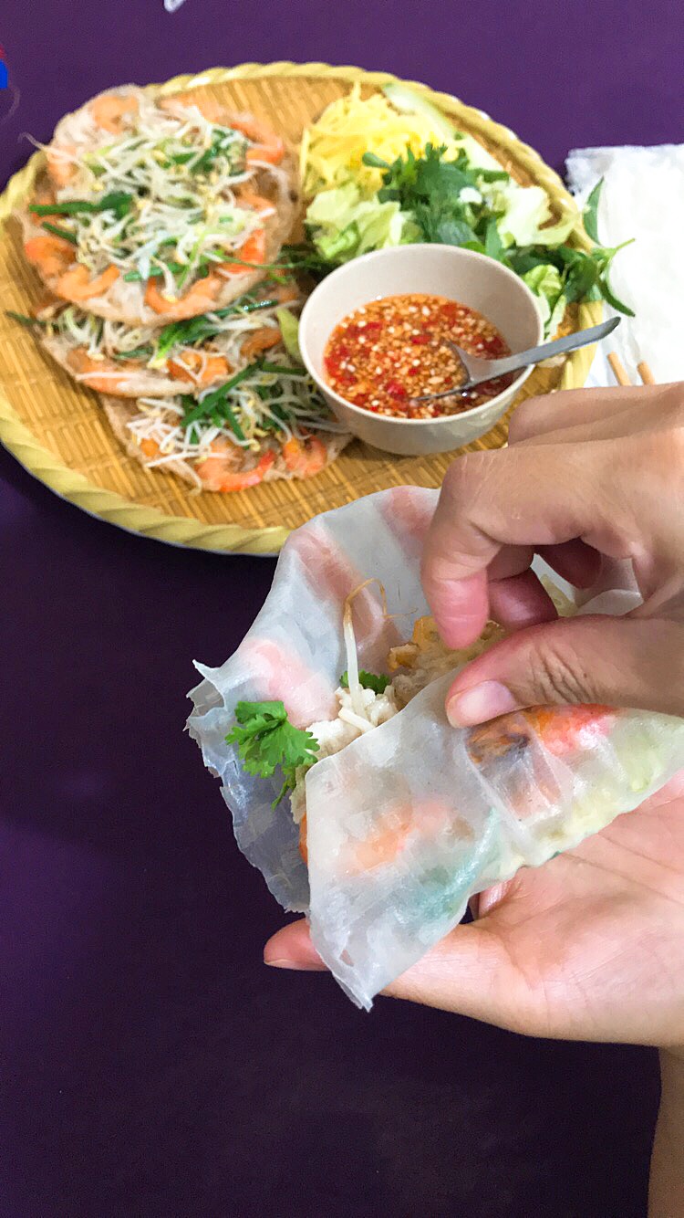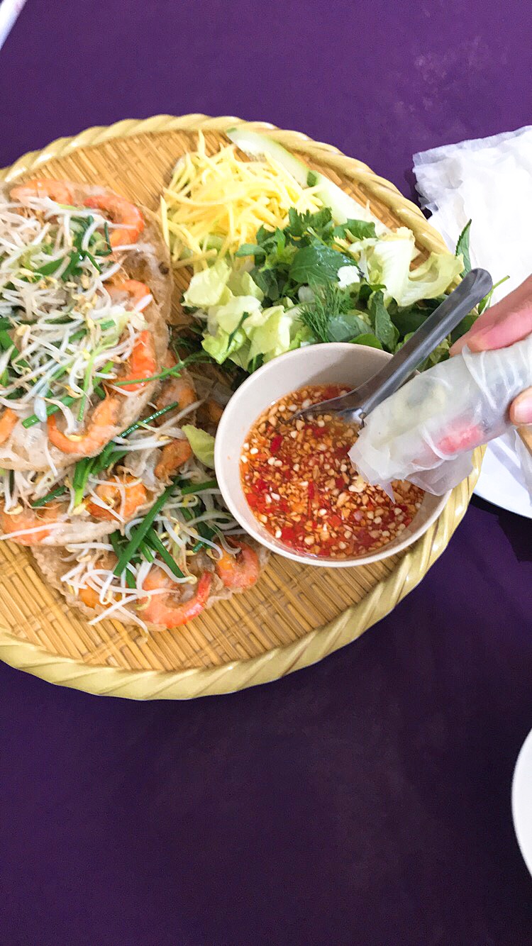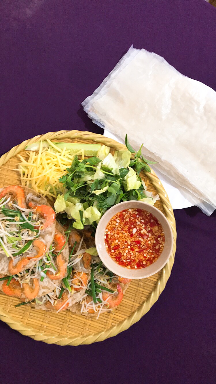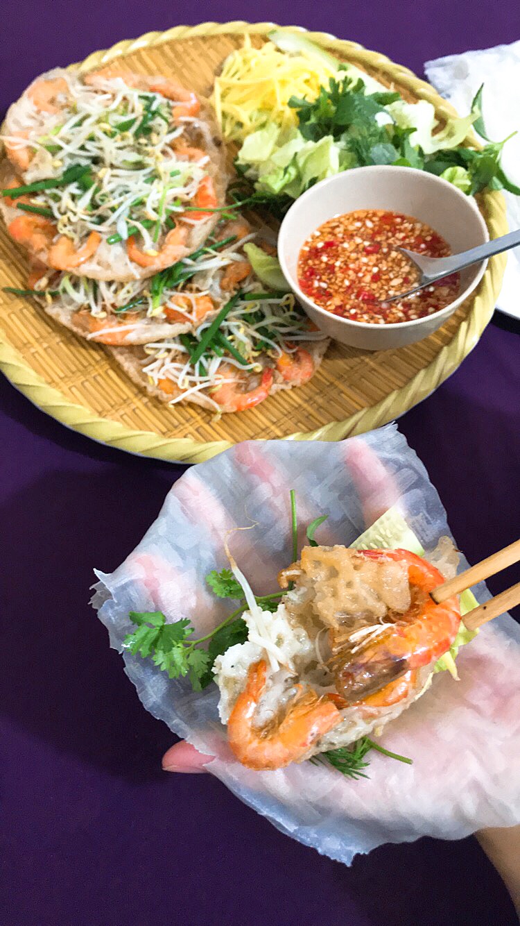 Qui Nhon is a coastal city located in southern Vietnam. It takes almost 2 hours to get to Qui Nhon from Hanoi by plane. Qui Nhon is famous for its many sea-flavored dishes. One of the dishes is a frsh shrimp pancake that is made from fresh sea shrimp.